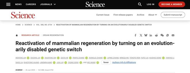 该研究揭示了高等哺乳动物再生能力丢失的关键机制,相关成果已于 6 月 27 日发表在《科学》上(IT之家附 DOI: 10.1126/science.adp0176)。