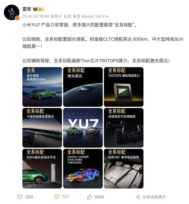 在社交网络上向来谦逊的雷军,于小米首款纯电 SUV 车型小米 YU7 正式上市发布的前夕,写下了一条微博: