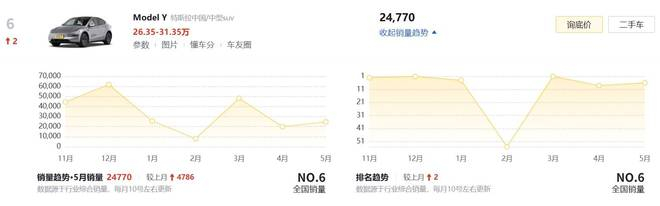 虽然在 3 月,Model Y 国内销量再次突破 4 万,以 48189 辆的成绩重回单车型销量第一,但在 4 月和 5 月又下滑至 19984 辆和 24770 辆。焕新 Model Y 的统治力远远不如 2024 年。