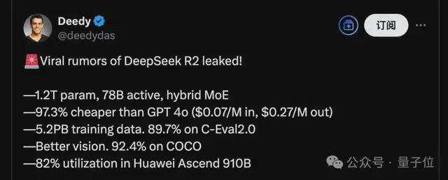 直到4月底,坊间开始疯传一组R2的泄露参数:1.2T万亿参数,5.2PB训练数据,高效利用华为芯片……一整个真假难辨。