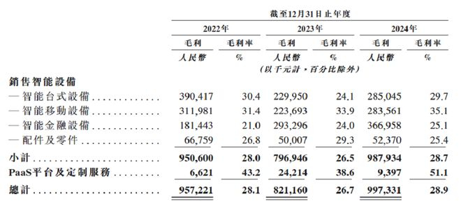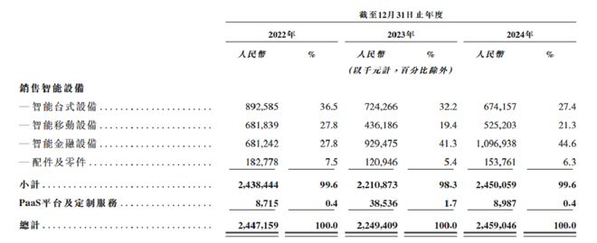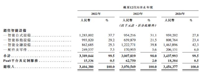 商米科技绝大多数收入来自销售智能设备,2022年-2024年,这部分业务对其年营收的贡献幅度分别达到99.5%、98%和99.5%。