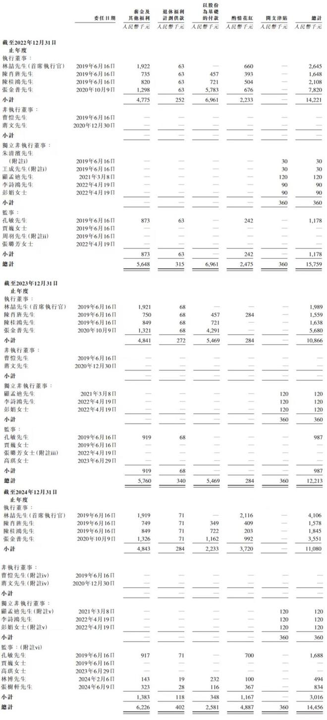 2022年-2024年,商米科技的高管、董事和监事以薪金、花红、股份等形式,分别领取了1576万、1221万和1446万的薪酬。