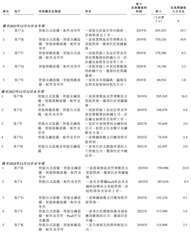 同期,商米科技来自前五大客户的营收分别为14.4亿元、8.9亿元及14.2亿元,分别占当年度总营收的42.3%、28.8%及41.1%;来自最大客户的收入分别为6.6亿元、5.1亿元及7.6亿元,分别占当年度总营收的19.3%、16.5%及22.0%。