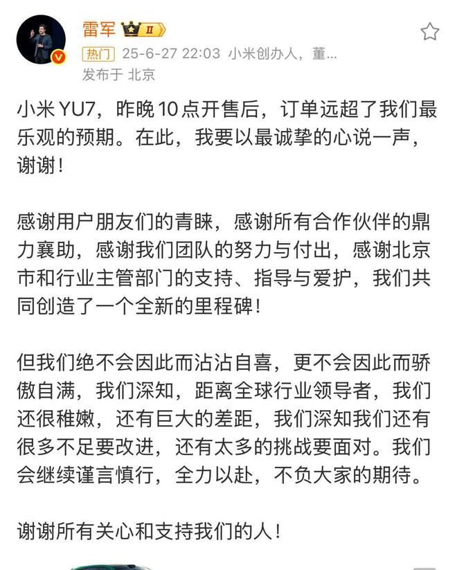 雷军确认不再公布小米YU7 24小时销量数据 市场资讯 2025.06.27 22:59 今日晚间,雷军发文称小米YU7昨晚10点开售后,订单远超公司最乐观的预期,并再次表示感谢。评论区有人问是否会公布24小时销量数据,雷军回应:“不公布了。”