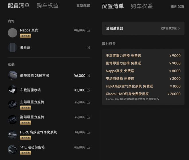 说到首销权益,雷总还是很厚道的,限时免费选配和首销赠送权益加起来确实不少,我觉得最实用的当然是HAD的终身免费和双零重力座椅。