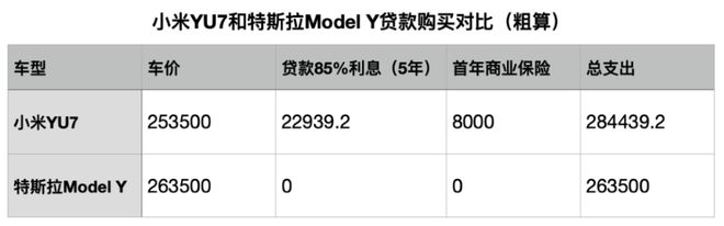 这样算的话,如果说特斯拉Model Y起步价减掉3.1w优惠按23.25万看待貌似也有些奇怪,但可以理解为,假如用同样的5年贷款85%的方式购买小米YU7标准版和特斯拉Model Y后轮驱动版,总支出分别为: