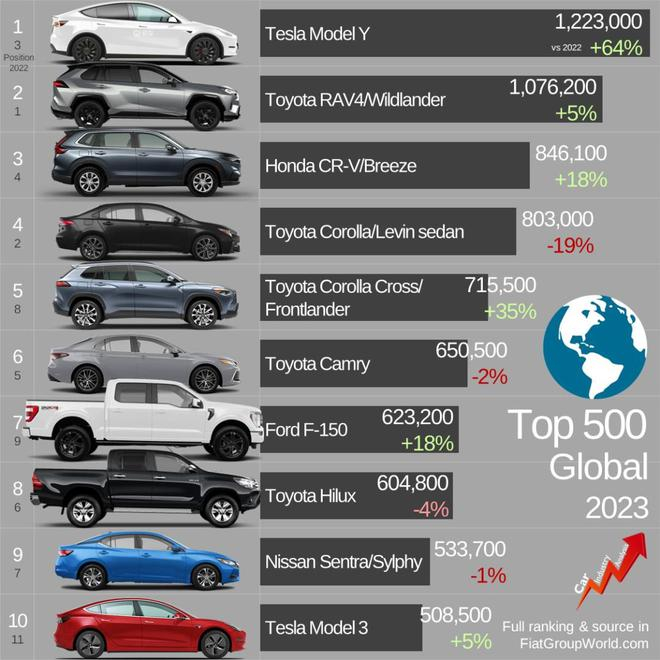 四年后的 2023 年,特斯拉 Model Y 的销量超过了老牌冠军丰田,成为了全球卖得最好的单一车型,这是整个汽车史上从未过的。