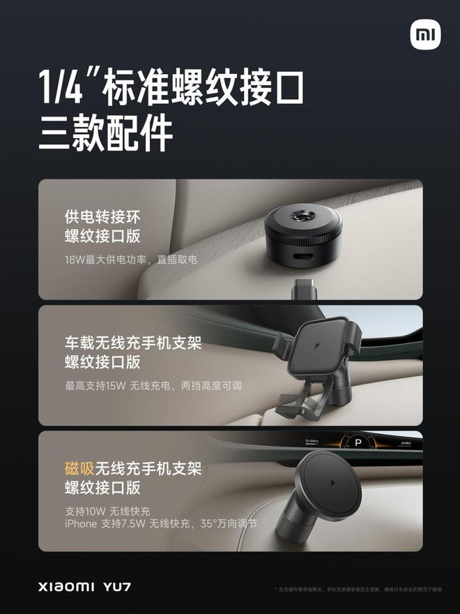 任何车里能用到的配件,比如纸巾盒、眼镜盒都,可以快速找到固定的锚点。甚至连 SU7 上就有的螺纹接口,这次也在 YU7 上变成了可以对外供电的版本,这样你的手机就可以在一个顺手的地方,始终保持充足的电量。