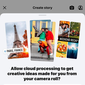 根据该媒体反馈,用户在社交应用中创建新 Story 后,会出现一个屏幕提示,询问用户是否选择加入“云处理”(cloud processing),以获得创意建议。