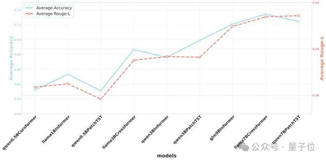ITFormer展现了卓越的“即插即用”特性。实验证明,它可无缝适配PatchTST、Informer、Crossformer等多种时序编码器,以及Qwen、LLaMA、GLM等不同规模和架构的大语言模型。此外,随着底层语言模型规模的提升,整体任务性能也随之稳步提高,表现出良好的可扩展性。