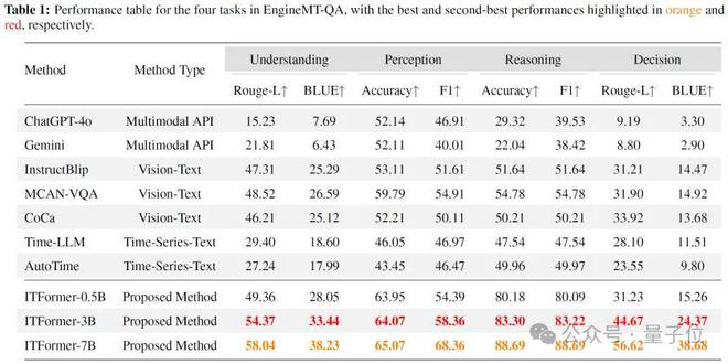 在EngineMT-QA数据集上,ITFormer的性能全面超越了包括主流多模态API,如ChatGPT-4o、Gemini,以及专用时序-文本模型Time-LLM、AutoTime在内的所有基线。尤其在需要深度分析的“推理”和“决策”任务上,F1分数和BLEU得分的显著领先,证明了ITFormer对复杂时序-语言关系具备强大的建模能力。
