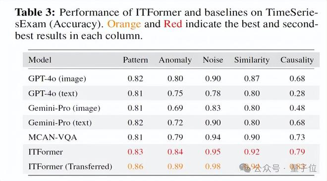 结果显示:1.ITFormer方法的有效性:即便不经过预训练,ITFormer直接在TimeSeriesExam上训练,其性能已在多个任务上优于通用基线,证明了其架构设计的先进性。 2.EngineMT-QA数据集的价值:在使用EngineMT-QA进行预训练后,ITFormer的性能得到进一步的巨大提升,在全部五项任务上均达到SOTA水平,其中“因果分析”准确率高达0.83。