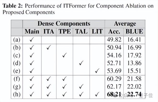 消融实验结果量化了ITFormer各核心组件的贡献。实验表明:TPE(时间令牌位置编码) 对模型性能的提升最为关键,是模型理解多维时序结构的基础。同时,ITA(指令时间注意力) 与TPE的结合能够产生显著的协同效应。最终,包含全部组件的完整架构性能最佳,验证了ITFormer系统性设计的有效性。