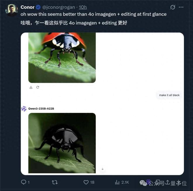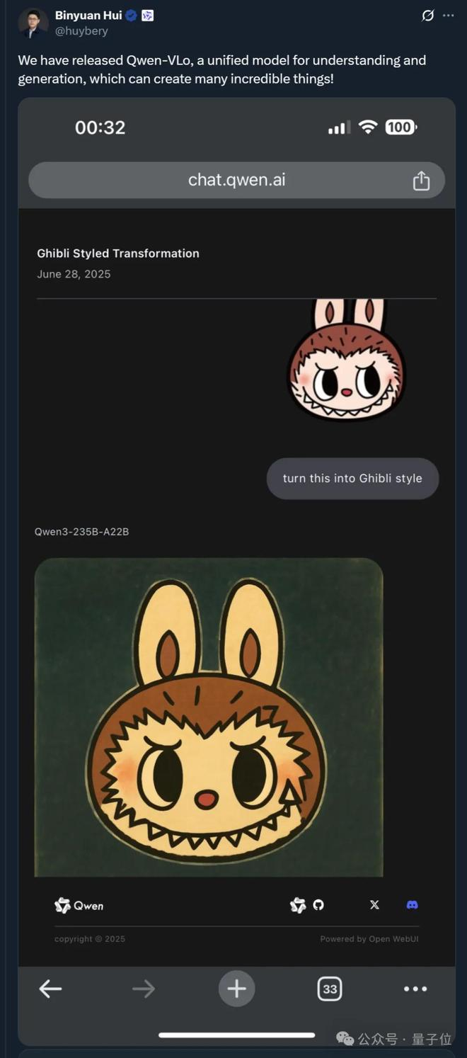 顺便一提,连Qwen团队成员之一Binyuan Hui也出来给大家打样,分享了吉卜力风格的某近日顶流。