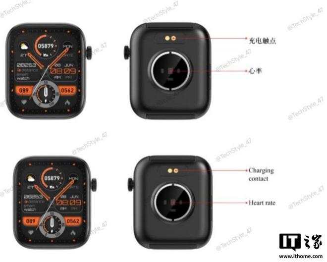参考相应渲染图,这款智能手表采用 1.9 英寸方形屏幕,右侧提供可旋转的表冠按钮,配备硅胶运动表带,手表支持心率和血氧监测功能,同时支持常规蓝牙通话、音乐控制、闹钟等基础功能,使用触点充电。