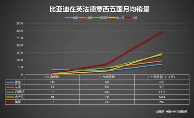 在德国慕尼黑街头,一辆比亚迪 ATTO 3 驶过宝马总部大楼 —— 这并非偶然景象。2025 年 5 月,比亚迪在欧洲五大核心市场交出 10199 辆的销量答卷,其中德国单月 1857 辆、英国 3025 辆,均同比暴涨超 400%,西班牙市场销量更是特斯拉的 3 倍。数据显示,比亚迪在欧洲 16 国市场总销量一马当先,5 月海外销量达 88640 辆,同比激增 133.6%。