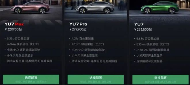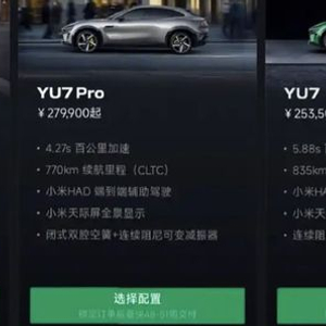 小米YU7一共有三款配置,分别是小米YU7标准版,售价25.35万元;小米YU7Pro版,售价27.99万元;小米YU7Max版,售价 32.99万元。小米SU7 Ultra选配赛道专业套装,售价62.99万元,还有小米SU7 Ultra纽北限量版,售价81.49万元。