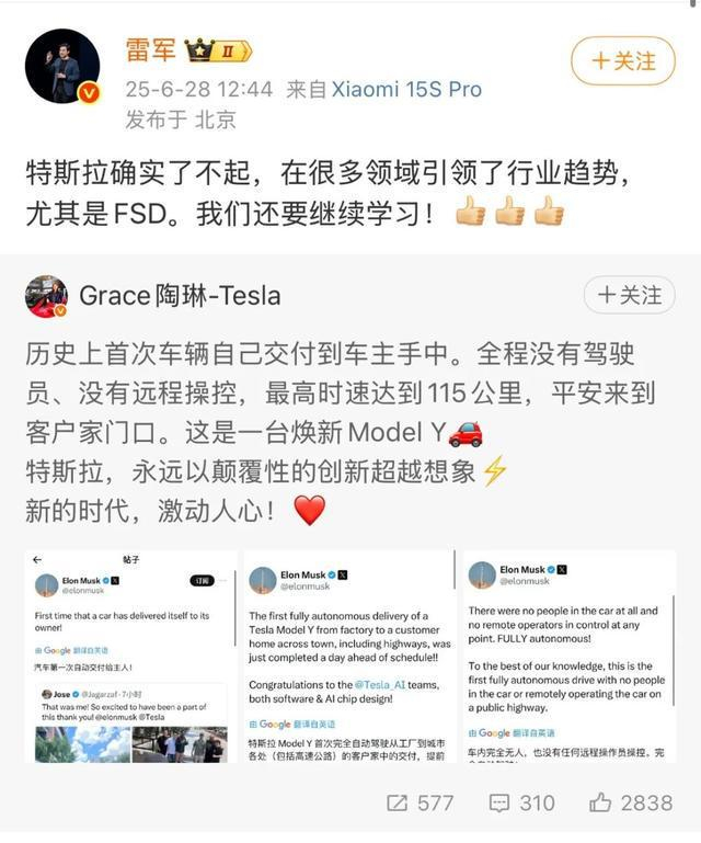 值得注意的是,小米集团创始人、董事长兼CEO雷军转发了该条微博并表示:“特斯拉确实了不起,在很多领域引领了行业趋势,尤其是FSD。我们还要继续学习!”
