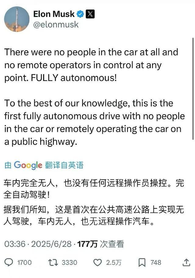 马斯克强调,据我们所知,这是首次在公共高速公路上进行的完全自动驾驶,车内无人,也没有远程操作员控制车辆。