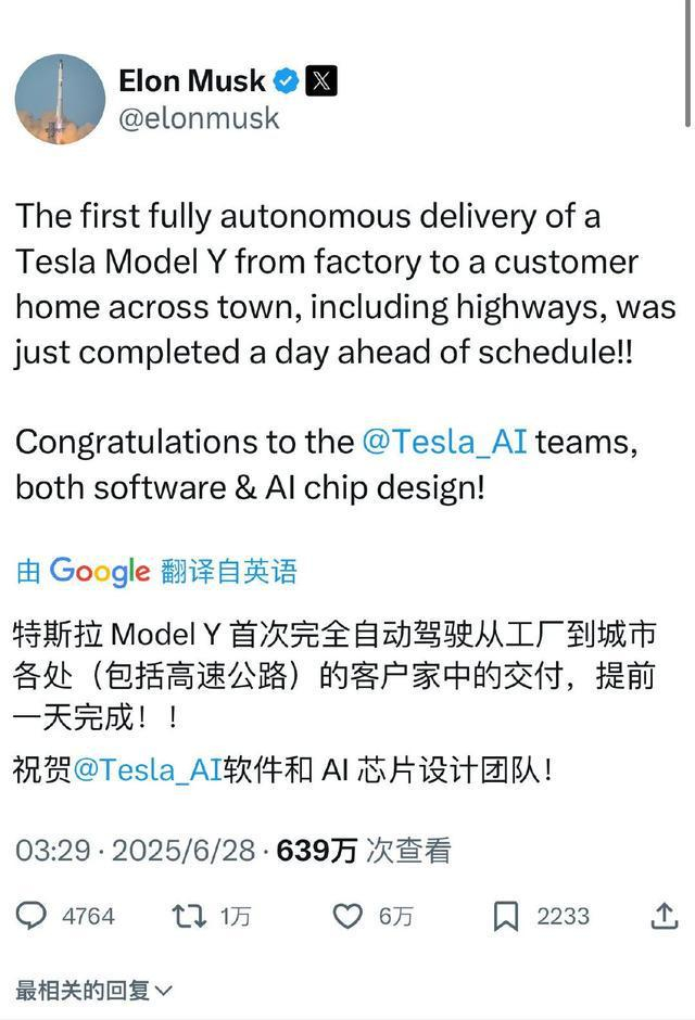 马斯克表示,公司已将一辆特斯拉Model Y从工厂自主交付到客户家中,并指出这次交付“跨越了城市”,且包含高速公路路段,比计划提前一天完成。