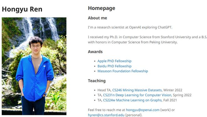 赵晟佳本科毕业于清华大学,并在斯坦福大学获得计算机科学博士学位,与Hongyu Ren为校友关系,两人在斯坦福的求学时期有四年重叠。加入OpenAI后,他曾参与GPT-4o和OpenAI o1、o3-mini的研究工作。