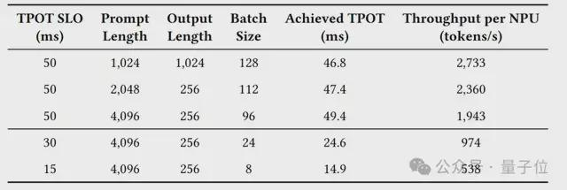 并且在TPOT<50ms的约束下,解码吞吐量达到了1943 token/秒/每NPU,即使收紧至TPOT<15ms,仍能维持538 token/秒,这就验证了全对等互联在严苛延迟场景下的稳定性。