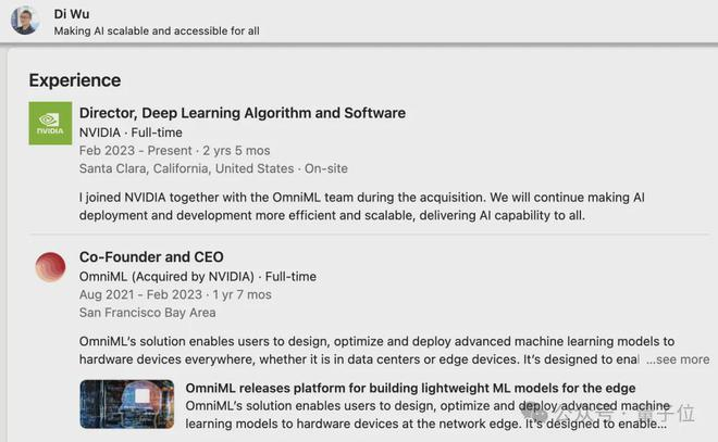 OmniML的CEO吴迪和CTO毛慧子同样也入职英伟达,吴迪成为深度学习算法与软件总监,毛慧子成为深度学习算法与软件团队的技术主管兼高级工程师。