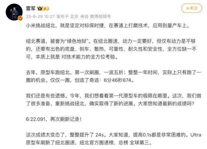 6月29日,小米董事长雷军在其个人微博发文表示,小米Ultra第一代原型车今年重新挑战了纽北,并以6:22.091的成绩再次刷新纪录,相比去年提升了24s。