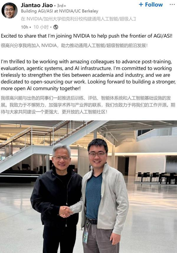 6月28日,本科毕业于清华大学的AI科学家朱邦华(Banghua Zhu)和焦剑涛(Jiantao Jiao)分别在社交媒体发布和英伟达创始人兼CEO黄仁勋的合照,宣布加入英伟达。