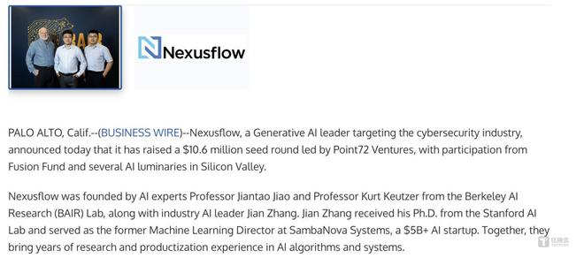2023年9月,Nexusflow宣布完成1060万美元(约7603万元)的种子轮融资,由Point72 Ventures领投,Fusion Fund和硅谷多位AI杰出人士跟投。