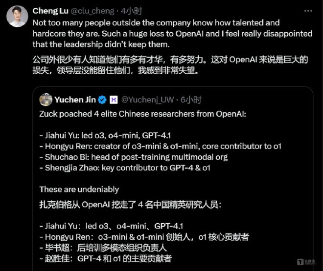 OpenAI的一名华人员工@clu.cheng似乎已经在X平台上证实了这一消息。他表示,这四位人才离职对OpenAI而言是巨大的损失,自己对OpenAI的领导层感到十分失望。但截至发稿前,这条推文已经删除。