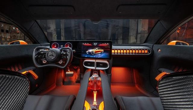 内饰方面,GT XX 概念车采用碳纤维桶椅与五点式安全带,搭配黑橙撞色主题,营造出强烈的战斗氛围。矩形方向盘集成了驾驶模式切换按键,悬浮双联屏则延续了奔驰的数字化传统。不过,极简中控布局与无后视镜设计等配置,预计将根据实际使用需求在量产车型中进行选择性保留。