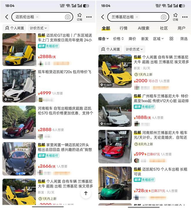 售价上百万元的兰博基尼、迈凯伦等品牌车型,闲鱼平台租车价格与其相差不多,甚至部分车型租金比小米YU7 Max更便宜。