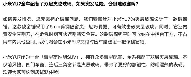 YU7双层夹胶玻璃如遇险情,是否很难破窗?小米回应