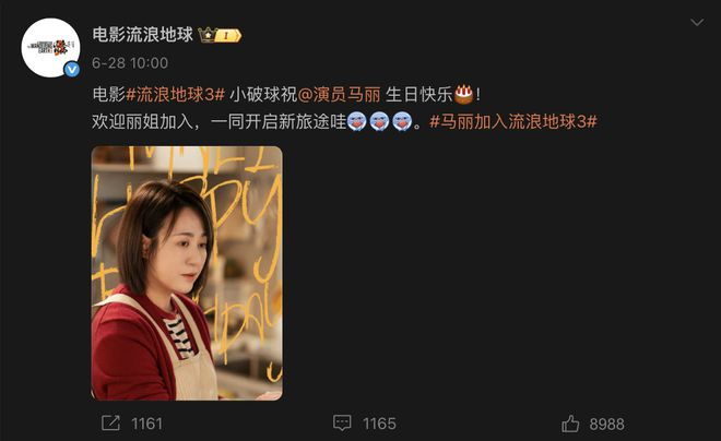 6 月 28 日,电影《流浪地球》官方发文为演员马丽庆生,并宣布马丽加入电影《流浪地球 3》。