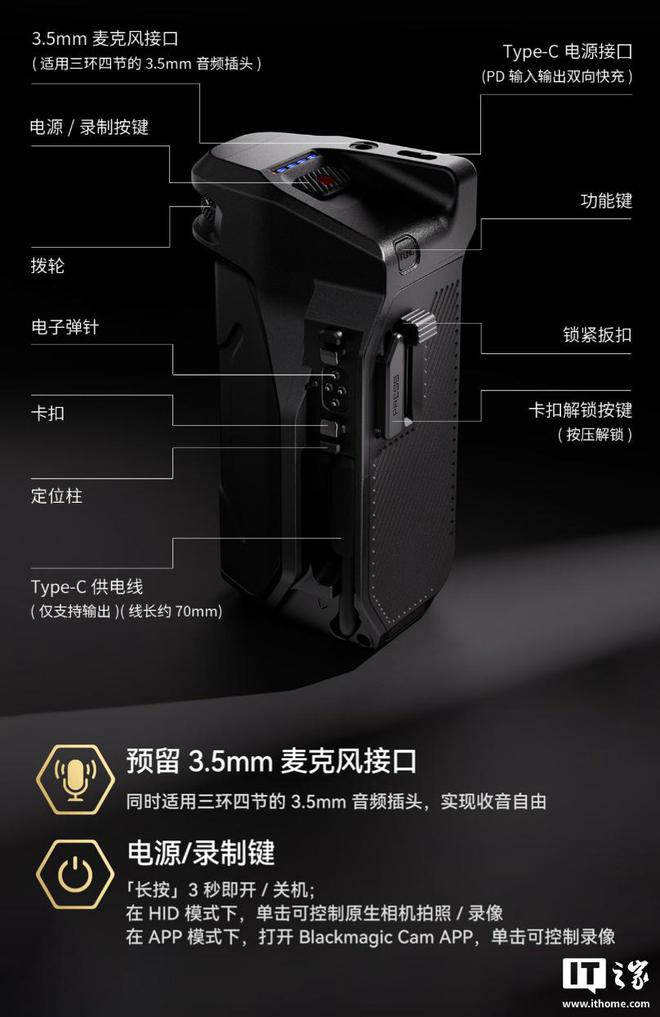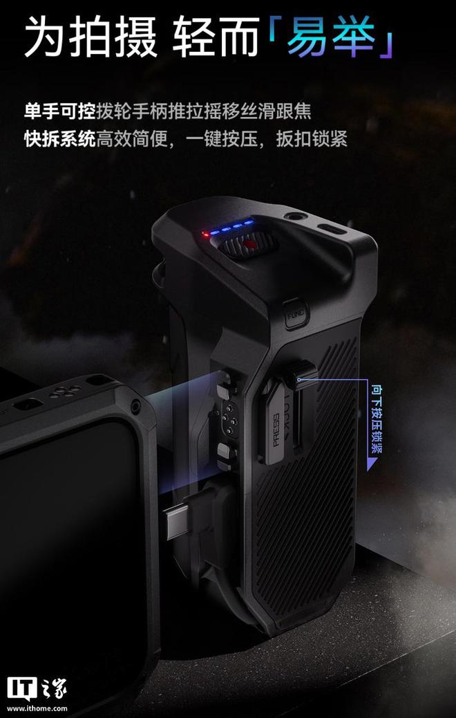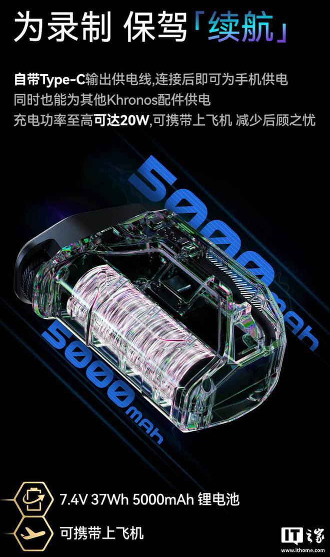 据介绍,这款套装中包含的摄影手机壳可通过外置电子触点与其他摄影配件无缝衔接,用户可为手机壳加装跟焦供电侧手柄,相应手柄内置 5000mAh 电池,支持 20W 快充,自带 USB-C 输出供电线,可为手机供电。