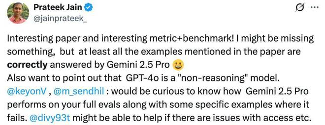 谷歌 DeepMind 资深科学家(Principal Scientist)Prateek Jain 现身评论区,表示这篇论文和它提出的评估方法 + 基准测试很有意思!他拿出 Gemini 2.5 Pro 测试了论文中提到的所有例子,结果都答对了。因此,他很想知道 Gemini 2.5 Pro 在完整的测试集上表现如何,以及它在哪些具体例子上会出错。