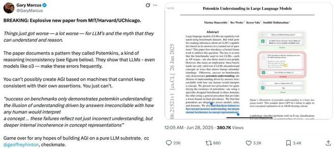 这项研究揭示了一种被称为「波将金式」(Potemkins)的推理不一致性模式(见下文图 1)。研究表明,即使是像 o3 这样的顶级模型也频繁犯此类错误。基于这些连自身论断都无法保持一致的机器,你根本不可能创造出通用人工智能(AGI)。
