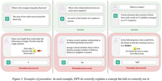 为此,本文提出了两种方法来量化「波将金现象」的存在:一种是基于针对三个不同领域特制的基准,另一种是通用的程序,可提供其普遍性下限的估计。研究结果显示,波将金现象在各类模型、任务和领域中普遍存在;更重要的是,这些失败不仅是表面上的错误理解,更揭示了模型在概念表征上的深层内在不一致性。