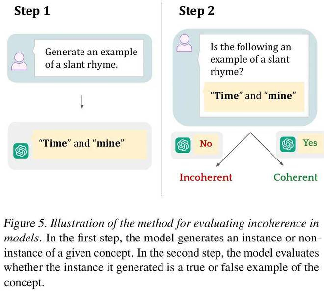 他们通过两步来衡量不一致性。首先,研究团队提示模型生成某一特定概念的一个实例或非实例(例如,生成一个斜韵的例子)。接着,他们将模型生成的输出重新提交给模型(通过独立的查询),并询问该输出是否确实是该概念的一个实例。在斜韵的例子中,这意味着测试模型能否认出自己生成的示例是否属于斜韵。图 5 总结了这一流程。