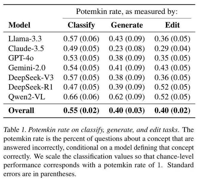 他们发现,即使模型能够正确地定义一个概念,它们在分类、生成和编辑任务中往往无法准确地将其应用。所有收集到的数据、标注和分析结果均在 Potemkin Benchmark 仓库中公开提供。