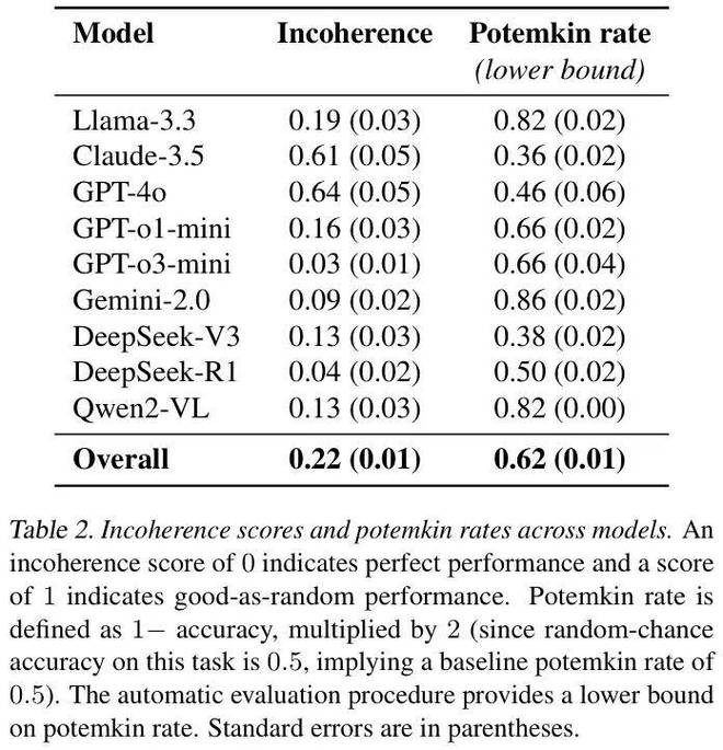 虽然模型在 94.2% 的情况下能正确地定义概念,但在需要使用这些概念执行任务时,其表现会急剧下降,这一点通过表中的高波将金率得到体现。尽管不同模型和任务间表现略有差异,但我们可以发现波将金现象在研究团队分析的所有模型、概念和领域中无处不在。