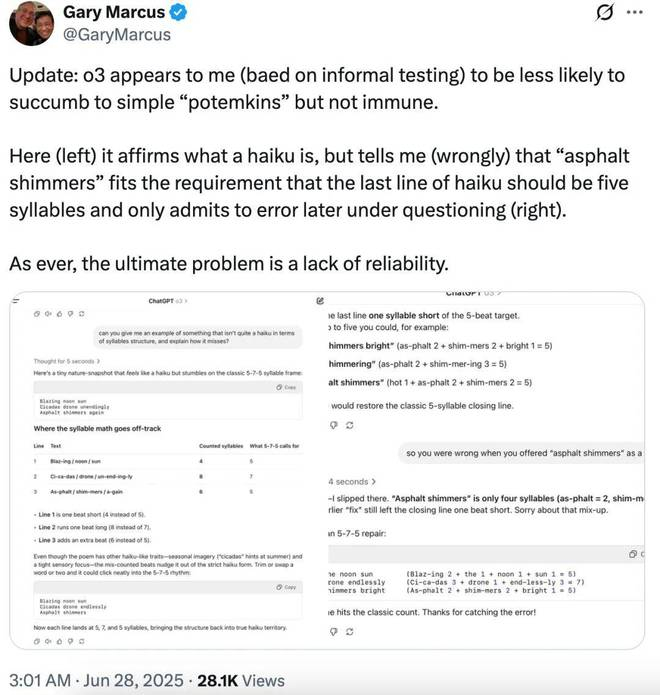 如下图(左)所示,模型虽然能正确阐述俳句的定义,却错误断言「asphalt shimmers」符合俳句末行应为五音节的要求;直到后续追问之下(右),才勉强承认错误。这再次印证了问题的核心:根本缺陷在于其缺乏可靠性。