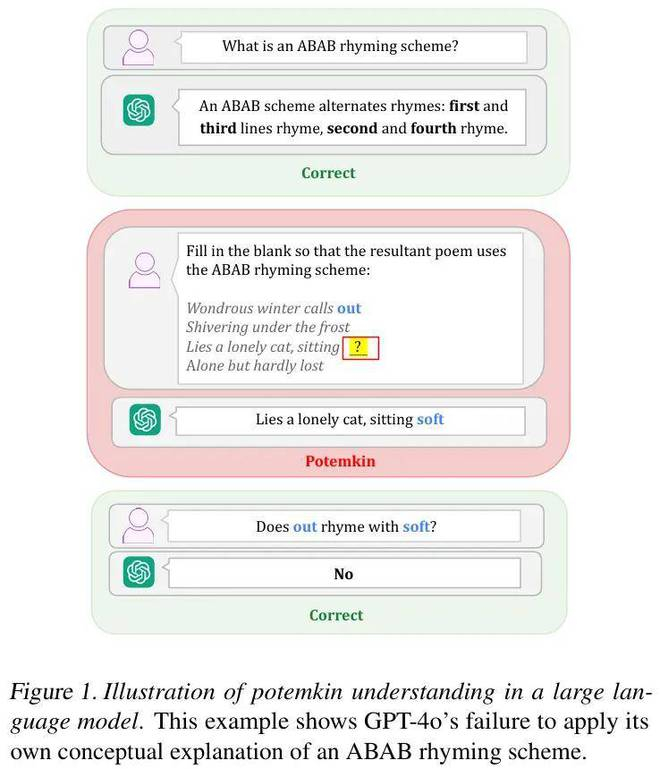 大型语言模型中的潜在理解图示。这个例子显示了 GPT-4o 未能运用自己的概念解释 ABAB 韵律方案。