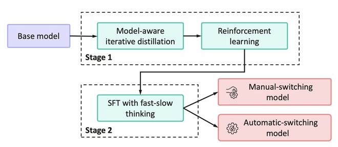此外,模型具备元认知能力,能够根据任务复杂度自动选择最优模式。华为通过一个创新的两阶段训练框架构建此模型,该框架融合了迭代蒸馏、模型合并以及由多源自适应奖励系统(MARS)引导的强化学习。