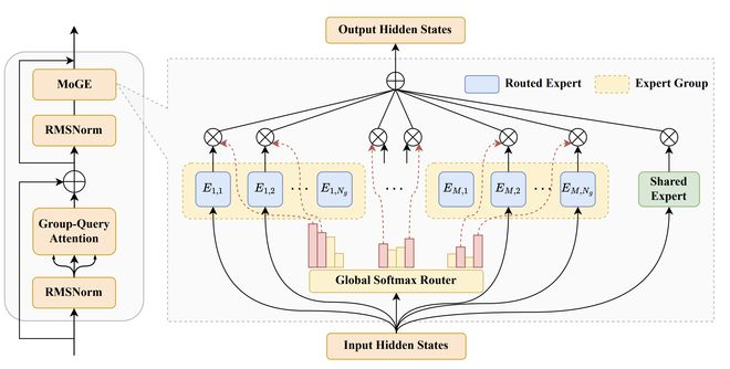 为此,华为提出了如下新型的分组混合专家模型(Mixture of Grouped Experts, MoGE),它在专家选择阶段对专家进行分组,并约束token在每个组内激活等量专家,从而实现专家负载均衡,显著提升模型在昇腾平台的部署效率。