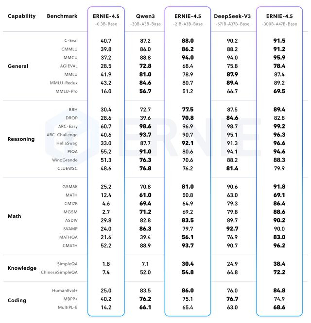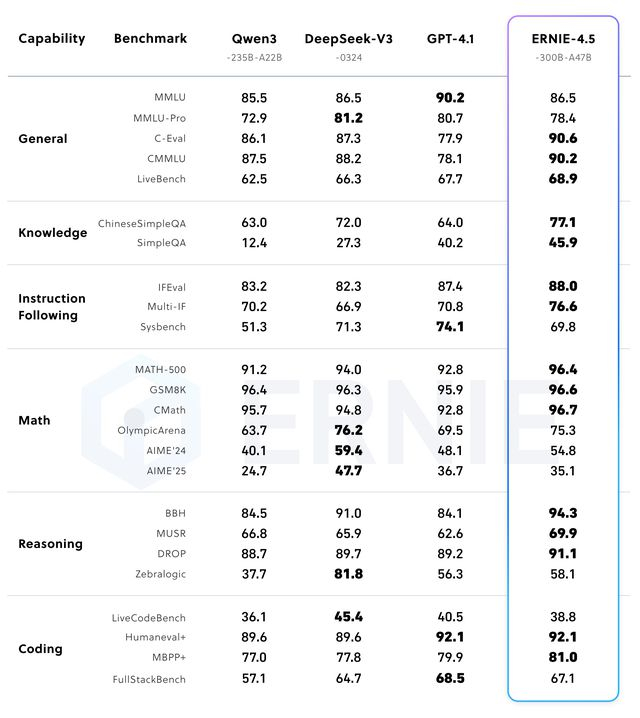 文心4.5-300B-A47B模型在主流基准测试中表现优异