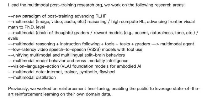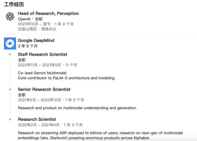 在 OpenAI 期间,他的核心研究方向包括:预训练新范式、多模态推理与高阶计算强化学习、多模态评分模型与评估体系、智能体系统整合、多模态 - 多语言认知协同、具身智能基础模型、多模态蒸馏技术等等。