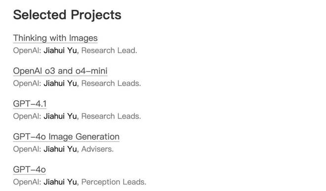 从他的精选项目中,我们可以看到,他作为研究负责人、顾问先后参与了 OpenAI 的「Thinking with Images」、o3 和 o4-mini、GPT-4.1、GPT-4o 及图像生成等重要工作。