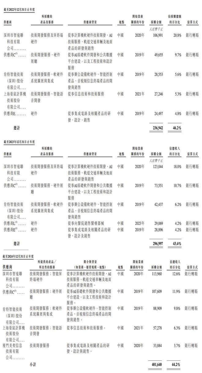 云知声的主要供应商为技术开发服务和硬件供应商,三年间,其向最大供应商采购的费用占同年采购总额的20.8%、18%、12.6%,前五大供应商占比46.2%、43.4%、44.2%。